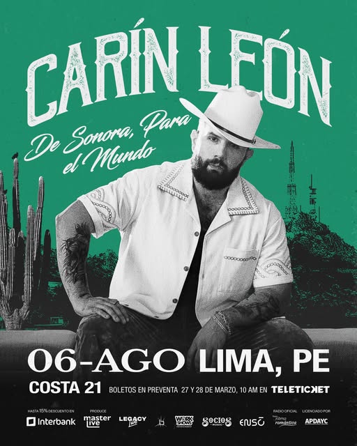 Las entradas para ver a Carín León en Lima estarán disponibles a través de Teleticket. Además, se ha confirmado una preventa exclusiva con Interbank los días 27 y 28 de marzo, o hasta agotar stock.