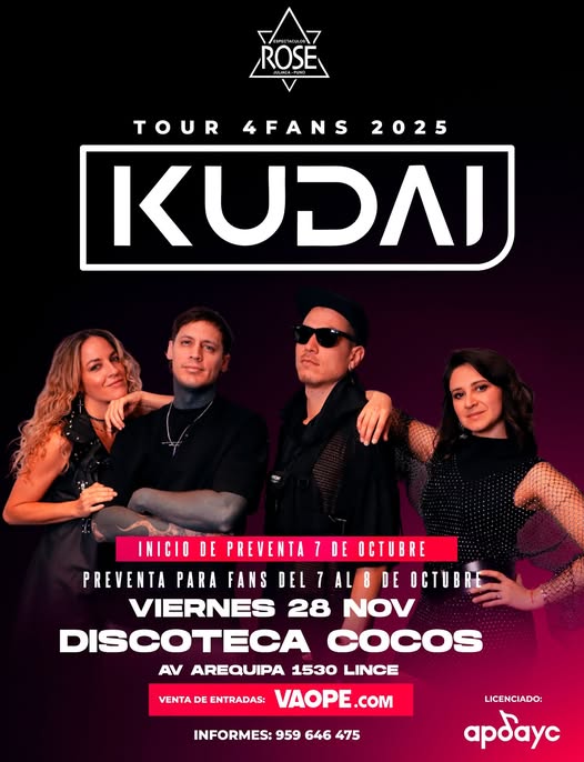 Los fans peruanos de la música pop-rock de los 2000 tienen una cita imperdible este viernes 28 de noviembre, cuando Kudai, una de las bandas más icónicas de esa generación, regrese a Lima para ofrecer un concierto lleno de nostalgia, energía y emociones. El show se llevará a cabo en la Discoteca Cocos, ubicada en Av. Arequipa 1530, Lince, un lugar perfecto para reencontrarse con las canciones que marcaron una etapa inolvidable.